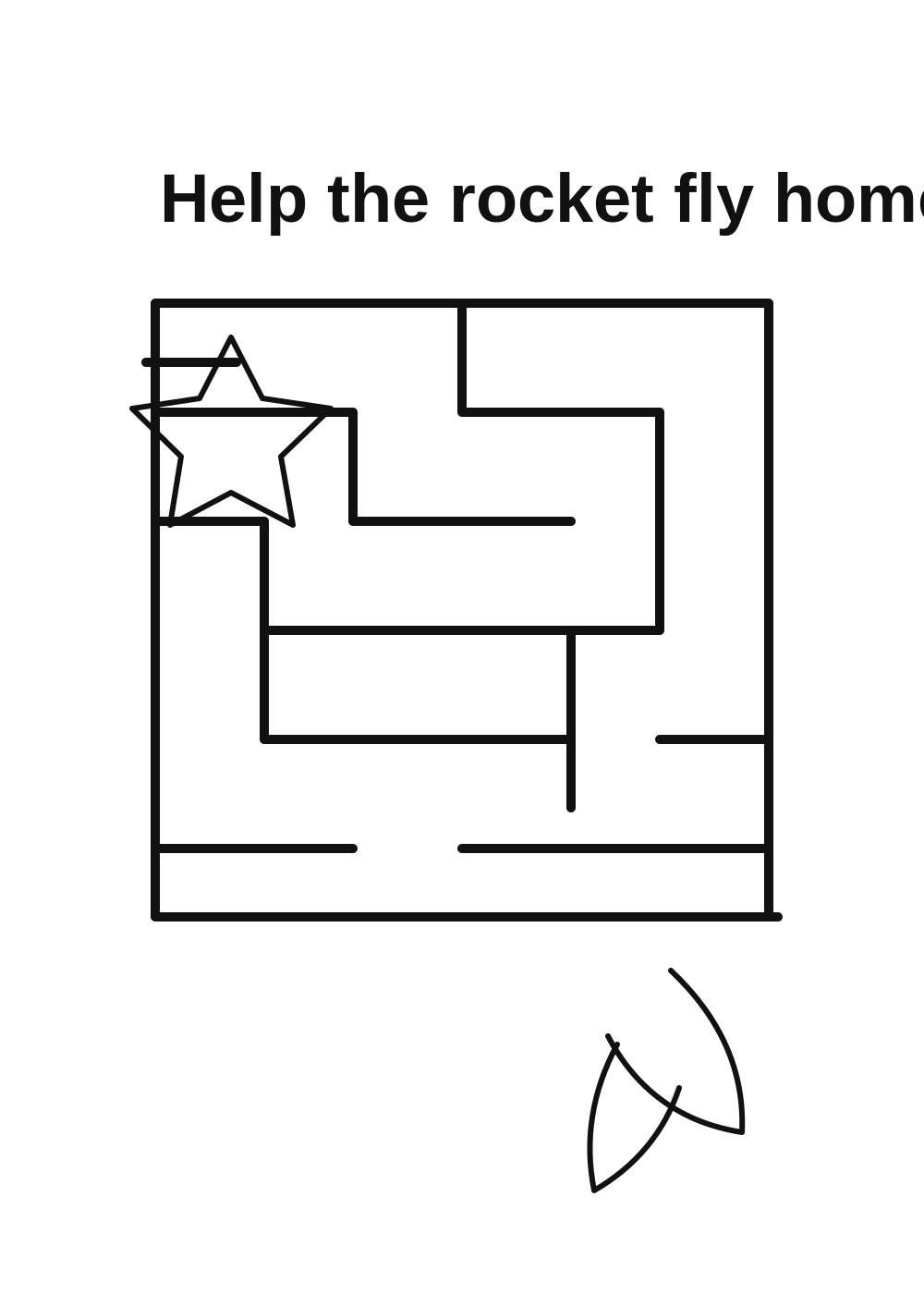 A simple printable maze where children guide a rocket through a clean path.