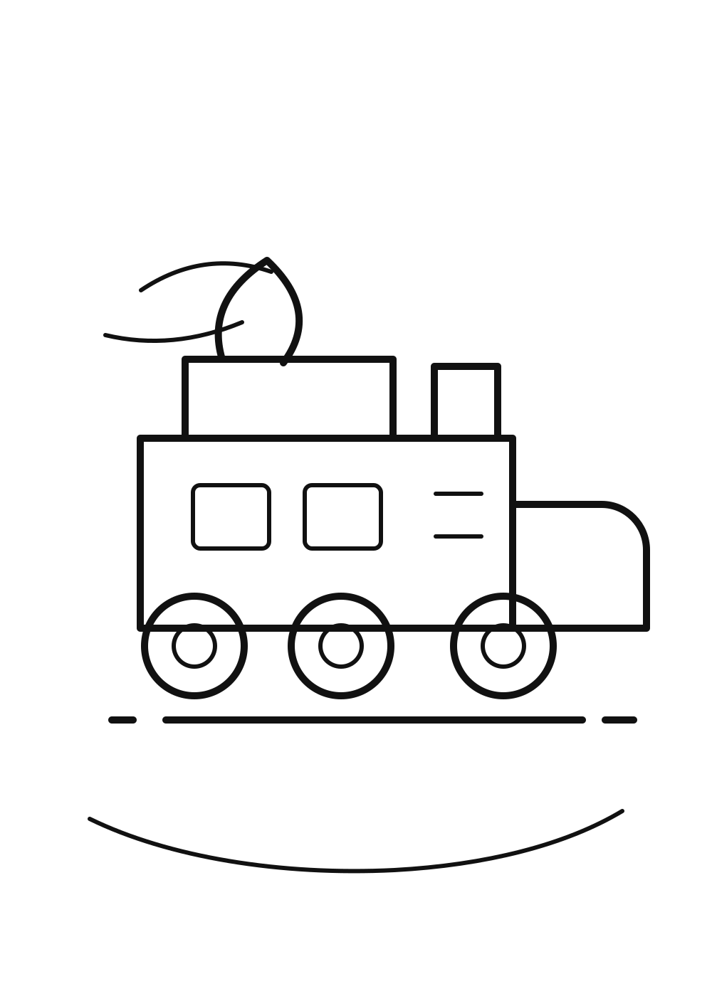 A locomotive train coloring page with carriages, wheels, and steam detail.